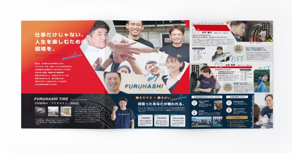 ロゴ・75周年ロゴ・ユニフォームといった企業の顔となるアイテムの制作がとても印象に残っています。 特に75周年ロゴについては、地域や同業者、取引先の皆さまにも自然と周知され、「そんなに長い歴史があるの?」と声をかけていただく機会が多く、企業の信頼感やブランド力が高まったと実感しました。 ロゴには創業から受け継がれる想いと未来へのビジョンが込められ、ユニフォームも社員が誇りを持って着られるデザインに仕上がり、社内の一体感が高まりました。 会社のブランドを「形にする」という体験ができ、これらのアイテムはフルハシタイヤの新たなステージを象徴するものになったと感じています。