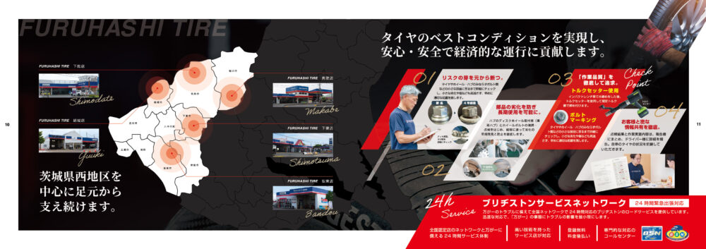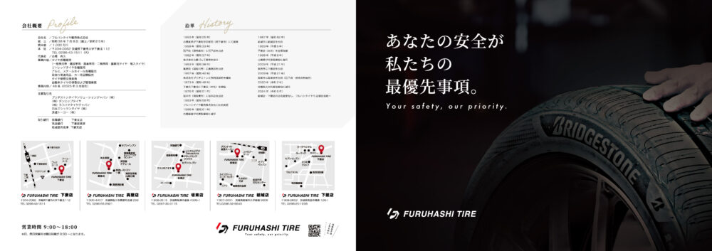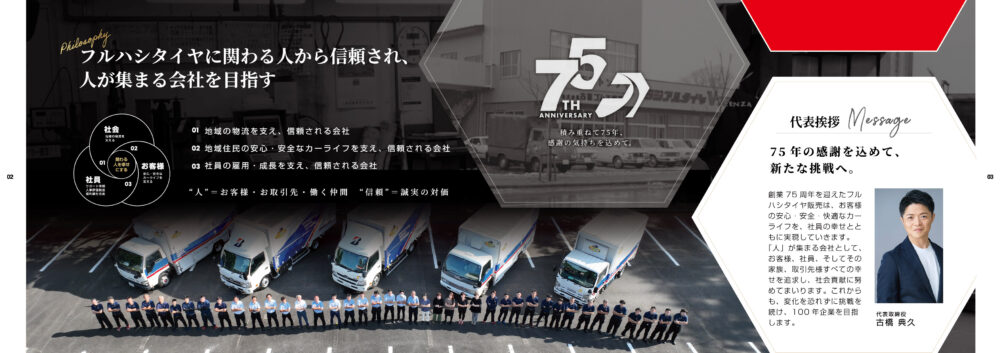 創業75周年を迎えたフルハシタイヤ販売は、お客様の安心・安全・快適なカーライフを、社員の幸せとともに実現していきます。「人」が集まる会社として、お客様、社員、そしてその家族、取引先様すべての幸せを追求し、社会貢献に努めてまいります。これからも、変化を恐れずに挑戦を続け、100年企業を目指します。